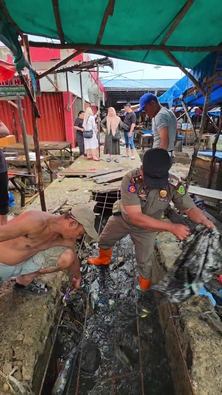 Mengantisipasi kerugian bagi warga pedagang satpol PP membantu menangani persoalan banjir di lokasi pasar panorama,dengan membersihkan saluran pembuangan dilokasi pasar yang di tutup menggunakan coran semen.